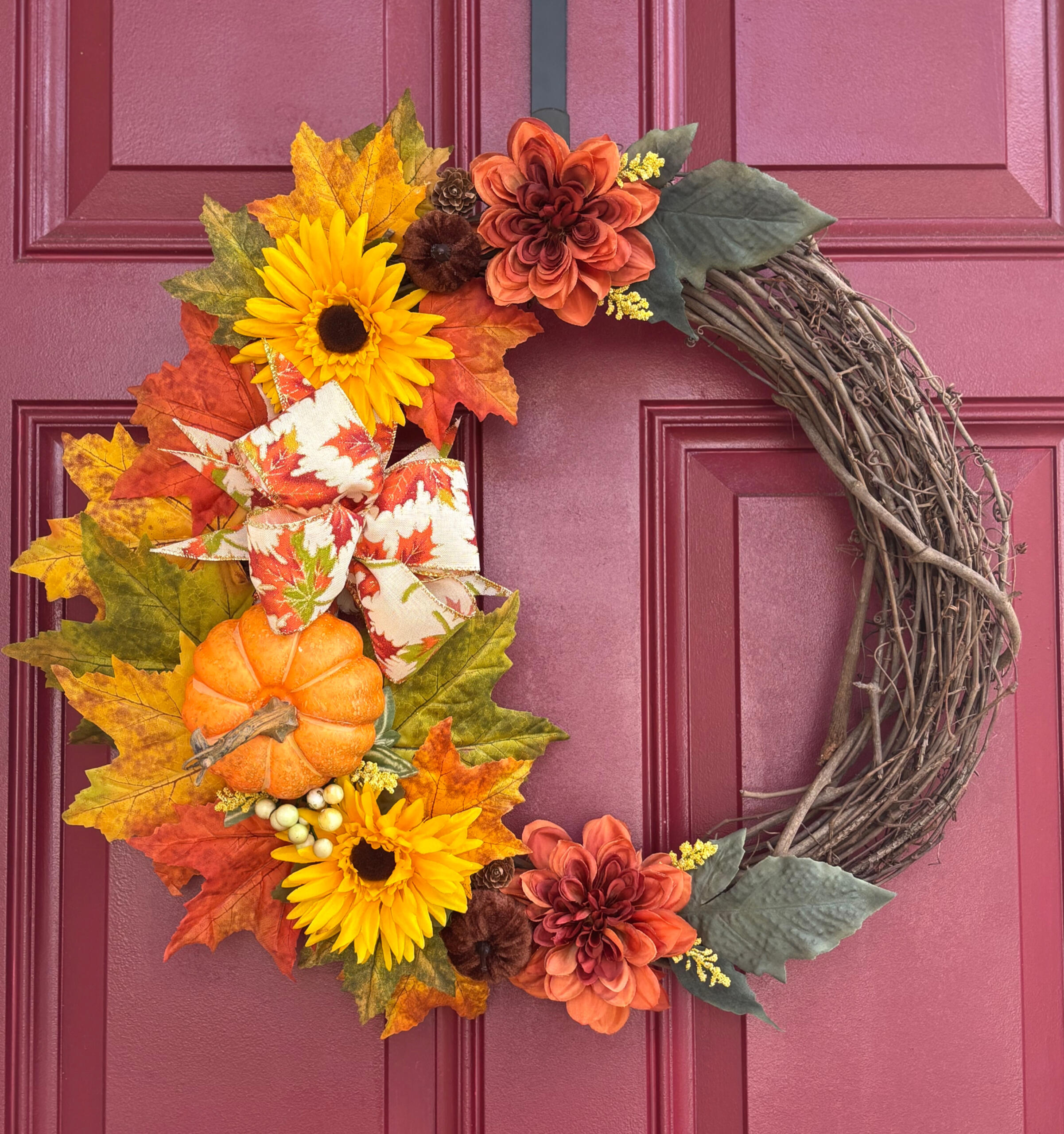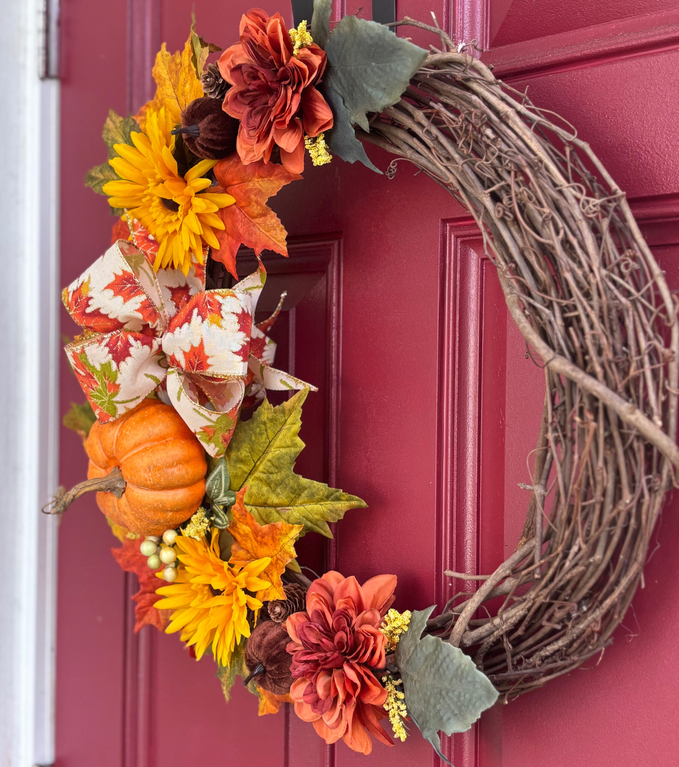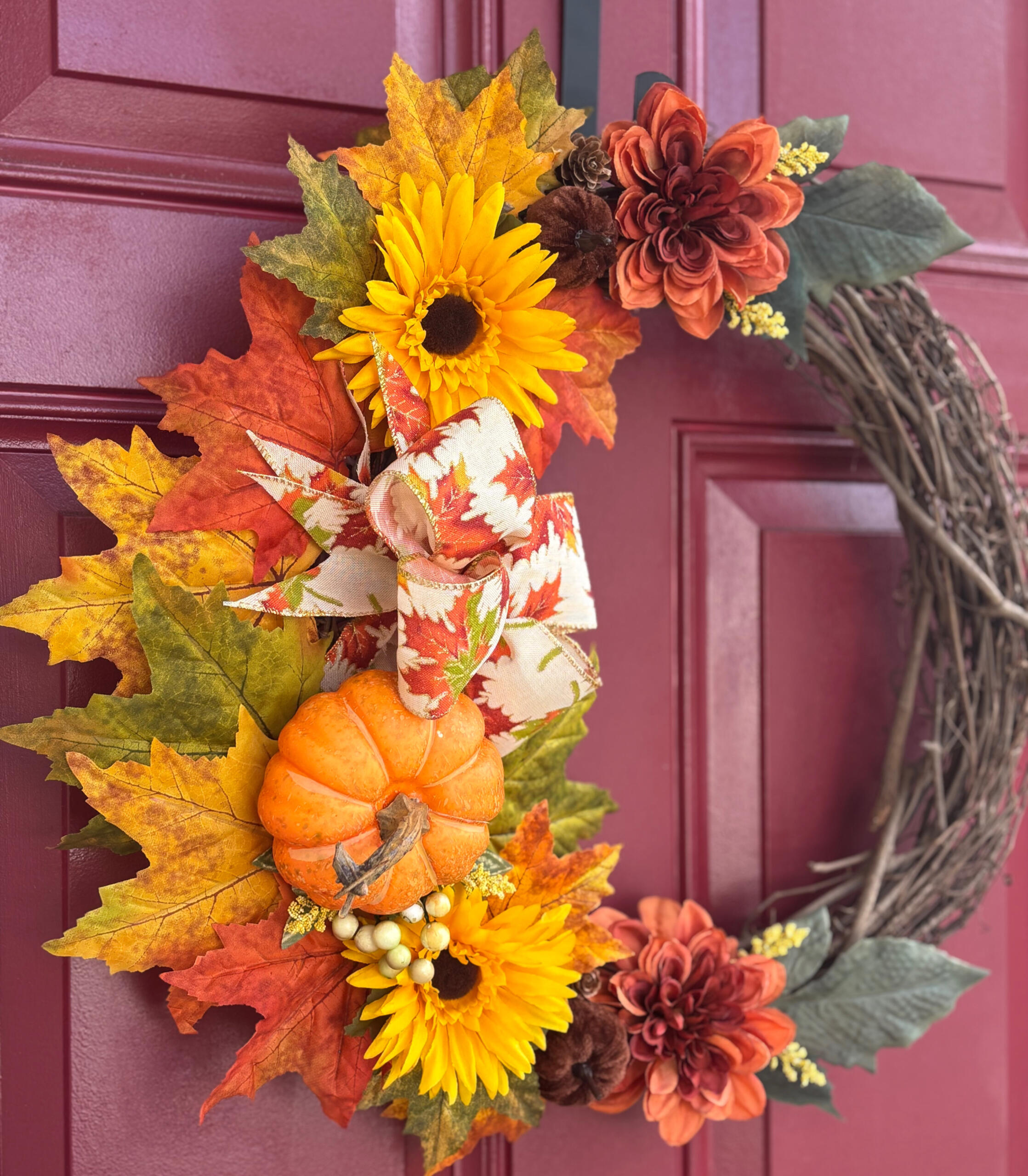 Bring the warmth of fall to your home with this 18” handcrafted grapevine wreath, featuring golden sunflowers, rust mums, mini pumpkins, berries, and pinecones. Layered autumn leaves and a festive metallic bow complete the look, making it perfect for your front door, mantel, or entryway.