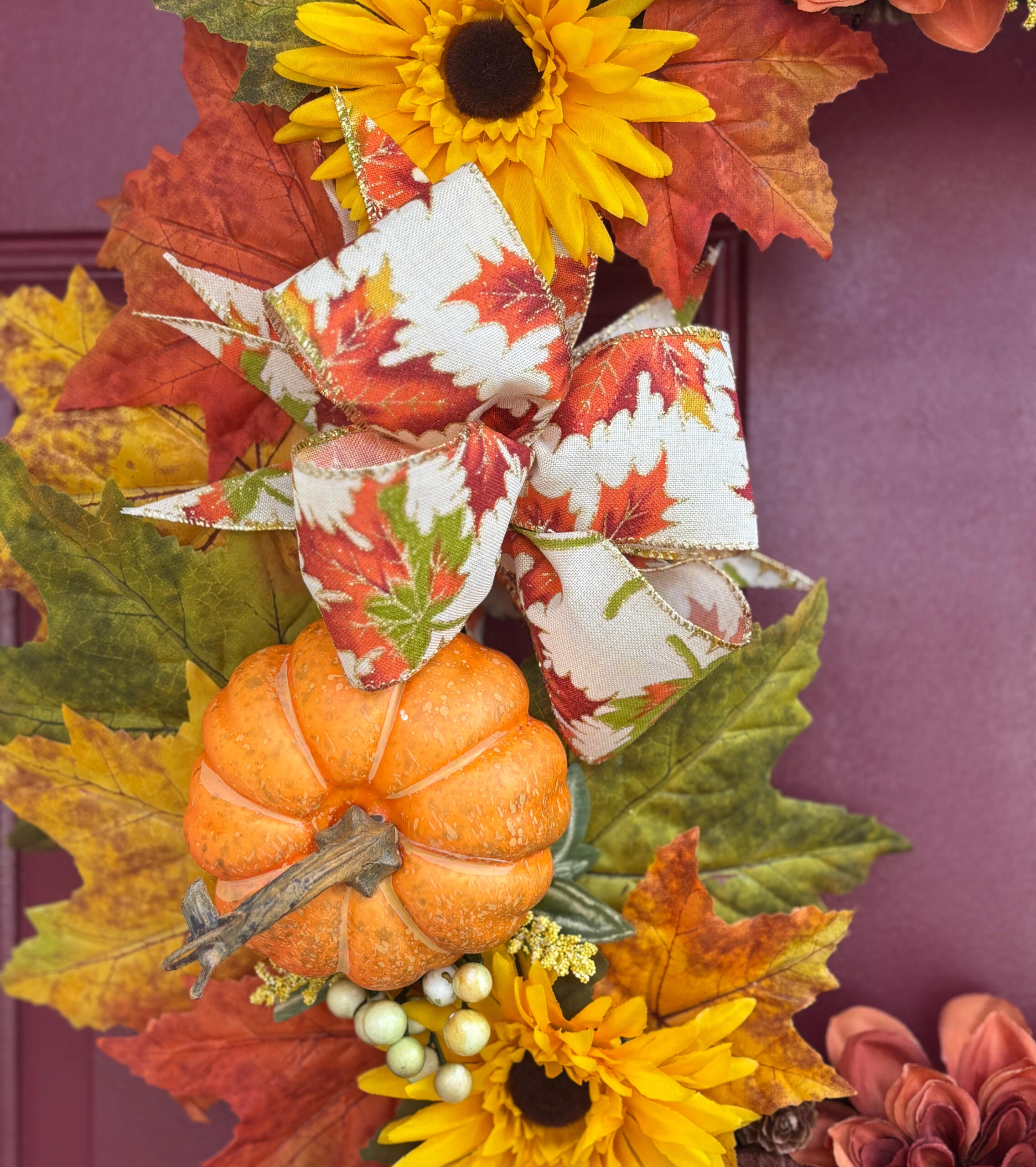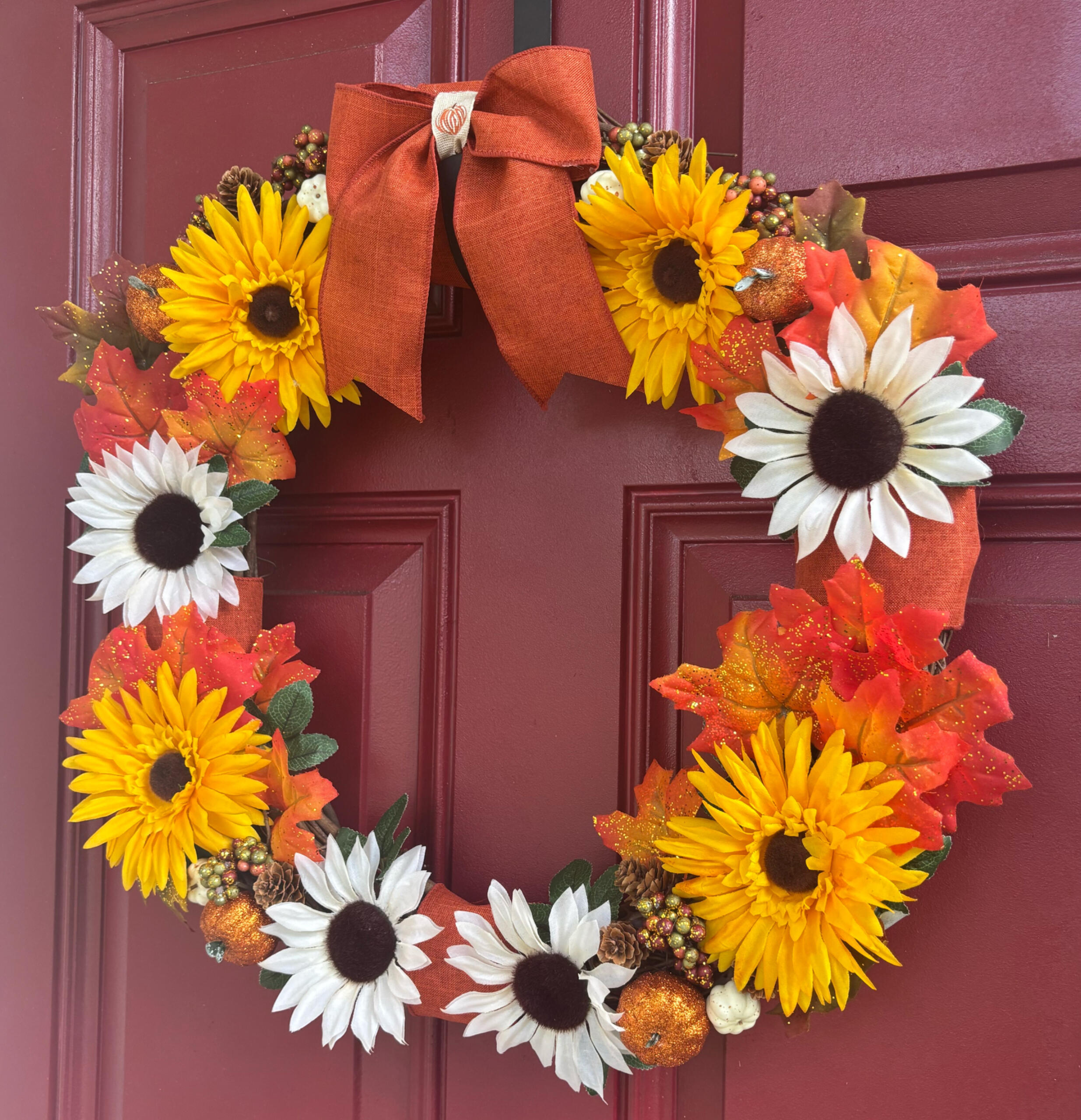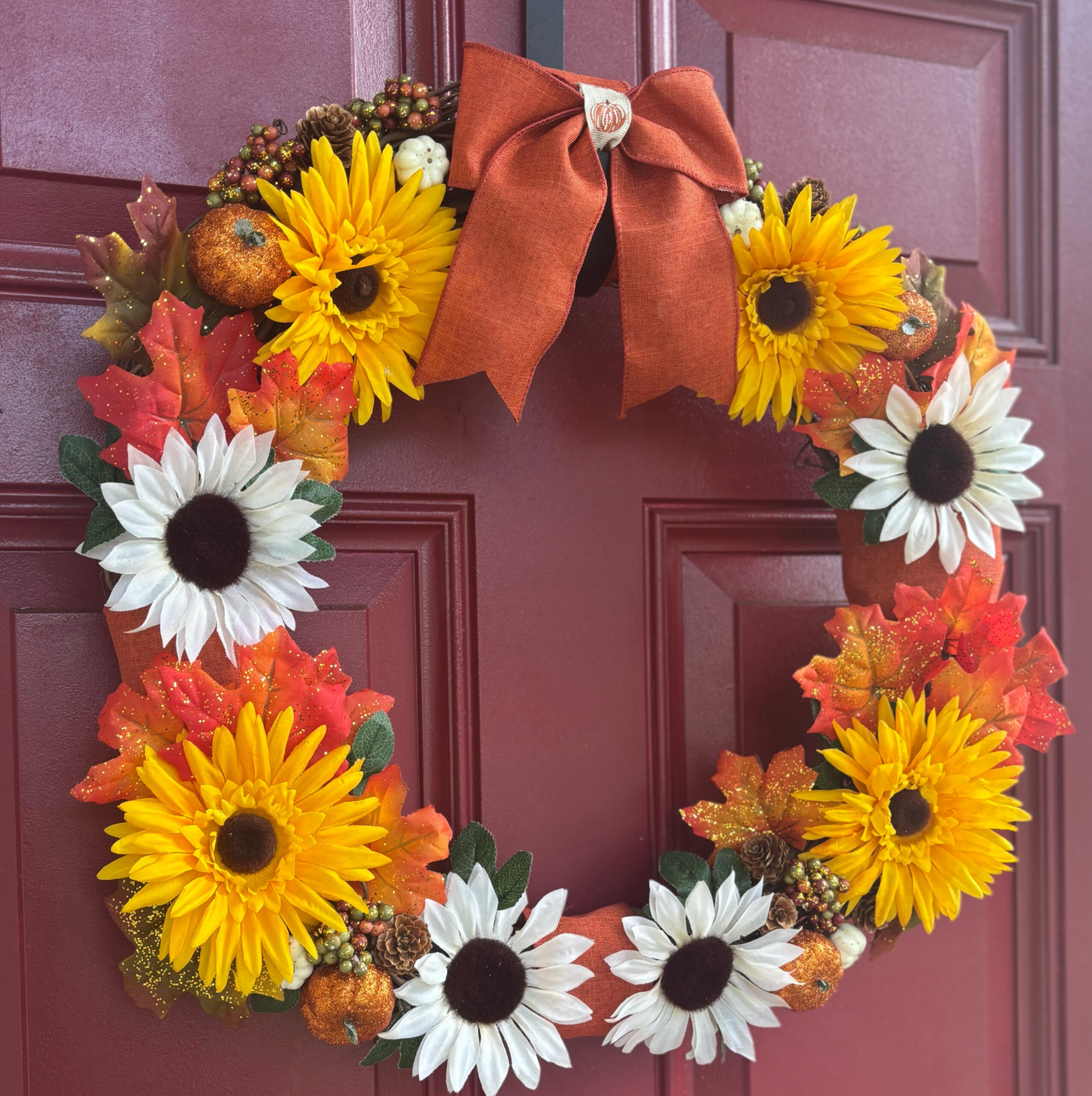 Bring the warmth of fall to your home with this 18” handcrafted grapevine wreath, featuring golden sunflowers, rust mums, mini pumpkins, berries, and pinecones. Layered autumn leaves and a festive metallic bow complete the look, making it perfect for your front door, mantel, or entryway.
