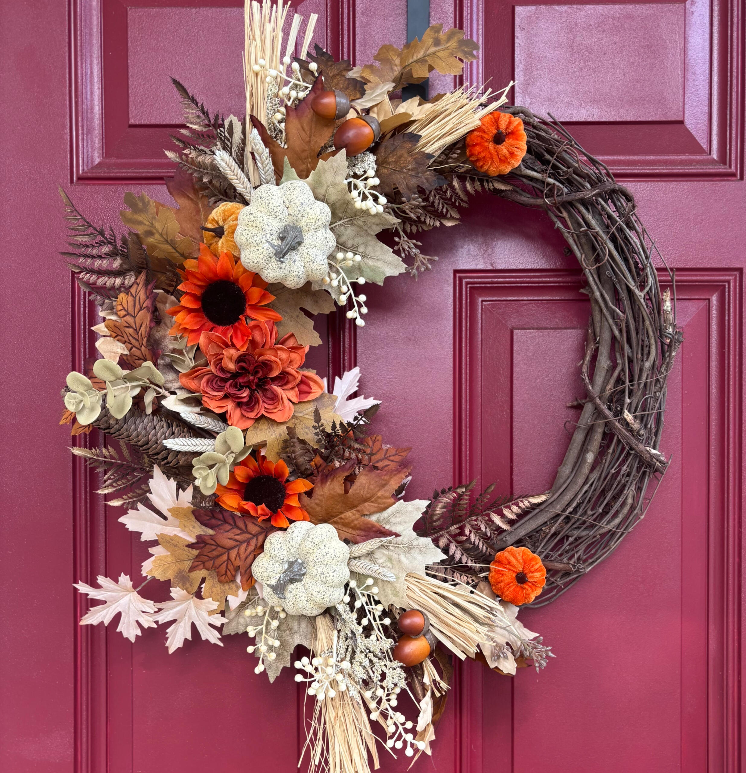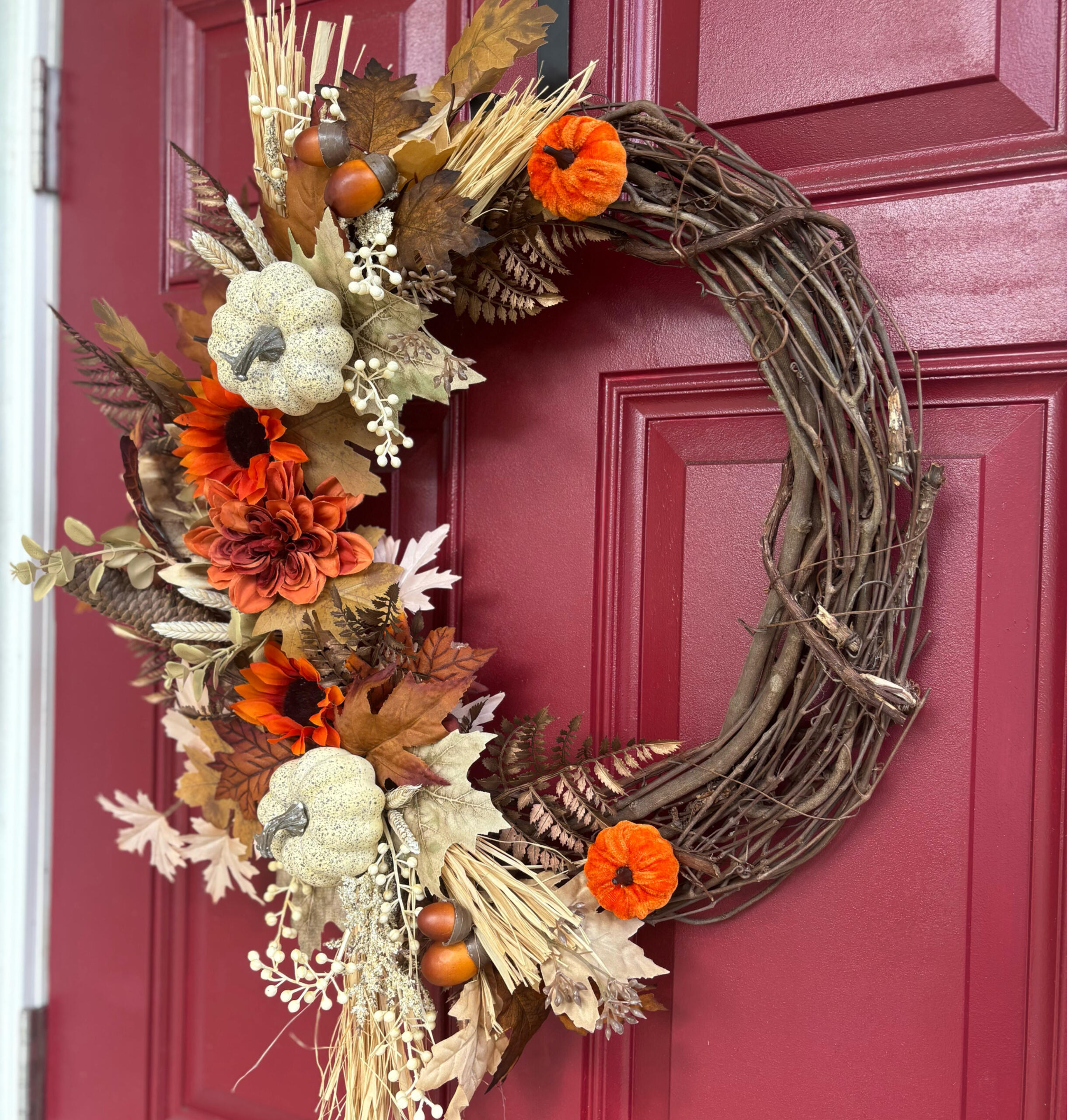 Rooted in the rhythm of the earth and the heart of home, this wreath honors the spirit of autumn — a season of balance, gratitude, and gathering. Ivory and orange pumpkins, dried grains, acorns, and golden leaves evoke the abundance of the second harvest, while warm rust florals and farmhouse textures create a welcoming, nostalgic feel.